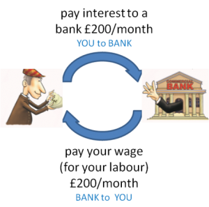 Imagine you took a loan of £100,000 from a bank. Let’s assume your monthly repayment is £800 to cover a principle and £200 to cover an interest. Remember, an interest is a bank’s spendable money (profit), unlike a principle that extinguishes with repayment. As you and your partner struggle to pay the whole monthly amount you decide to take on a job to cover at least the monthly payment of interest. It happened that a bank is offering a part-time job and pays £200/month. You are a successful candidate. Below is an illustration of a loop through which the money will flow.