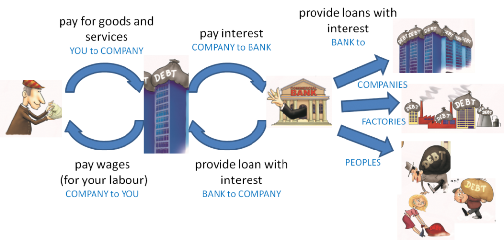 You earn money (by providing your labour and the most precious asset you have – your time) to pay an interest on money that a bank created out of nothing. It is the same money that you earn and spend on interest payment. No matter where you earn your money, and whether the money flows through a large or a small loop, its origin and final destination is a bank. This is because most of it is created in a banking system as a debt.